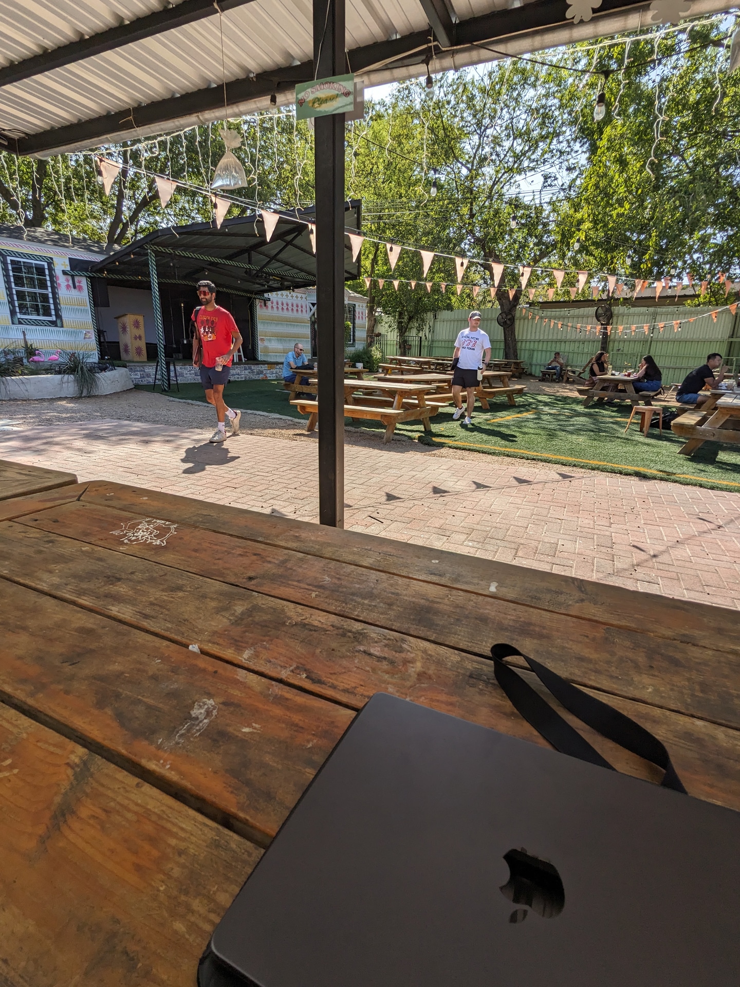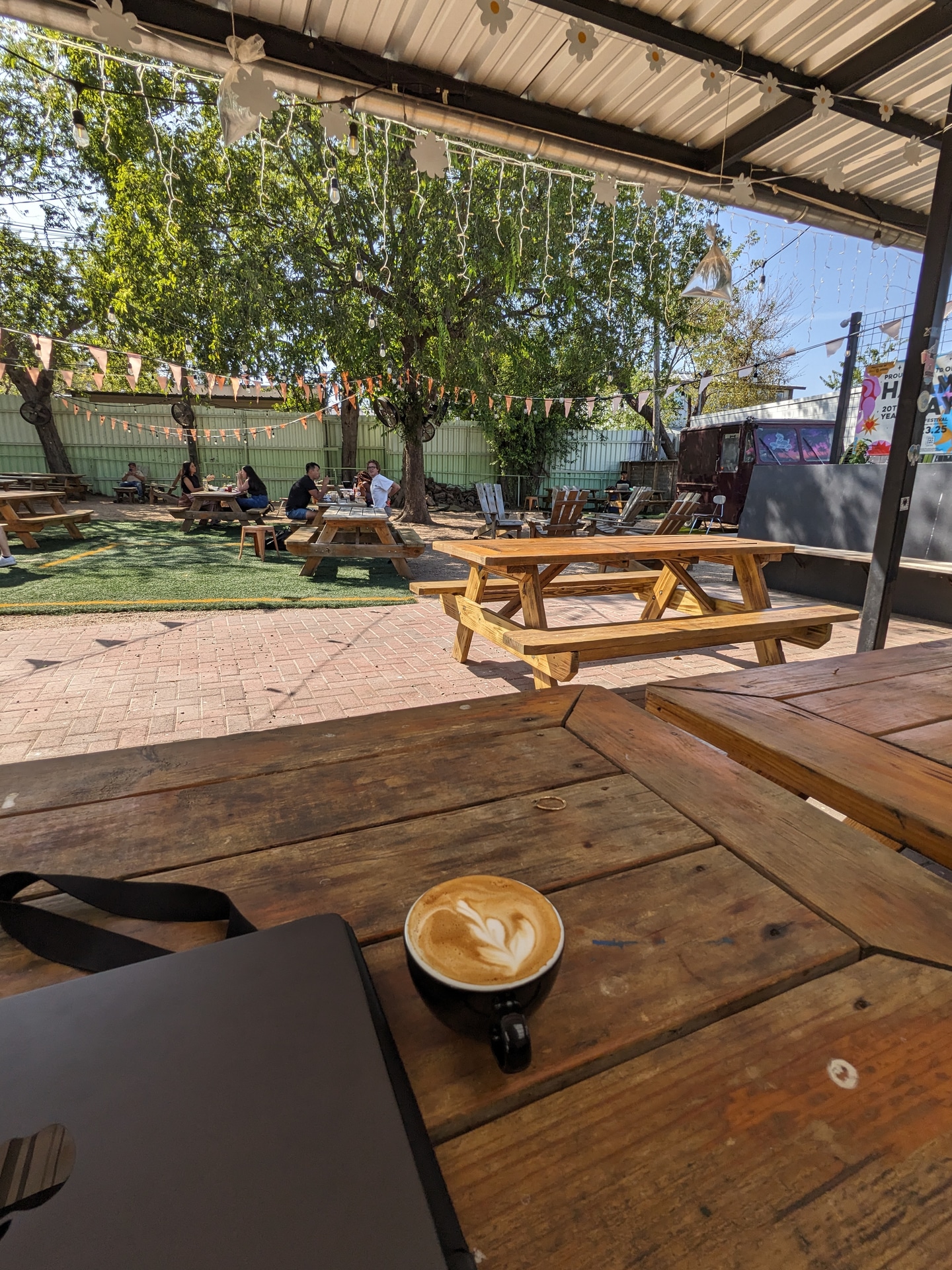 Good coffee. Has a nice big garden at the back with lots of tables. It got a bit warm in the afternoon. I stayed for about 2.5 hours and it never got full on a Wednesday afternoon.