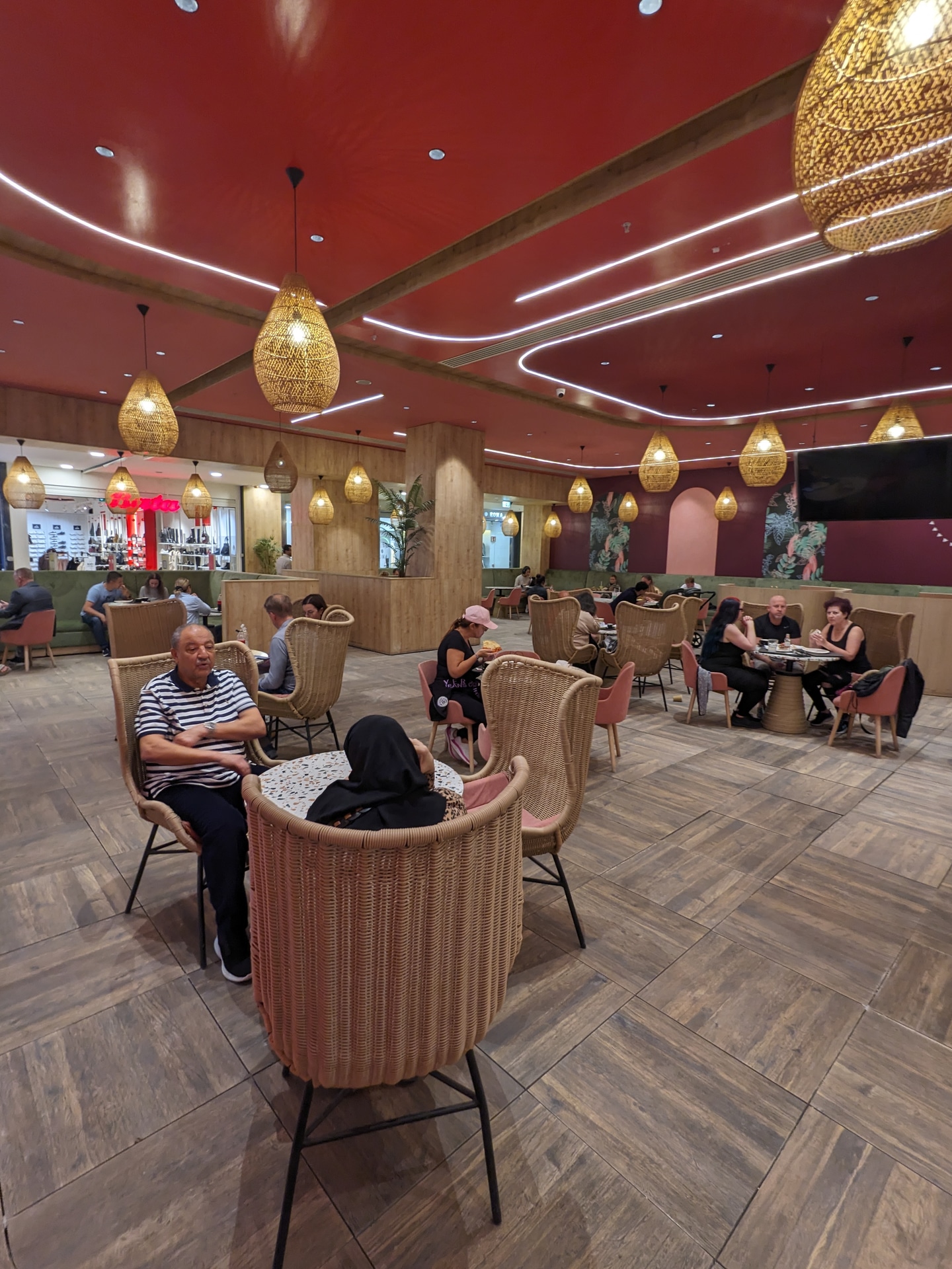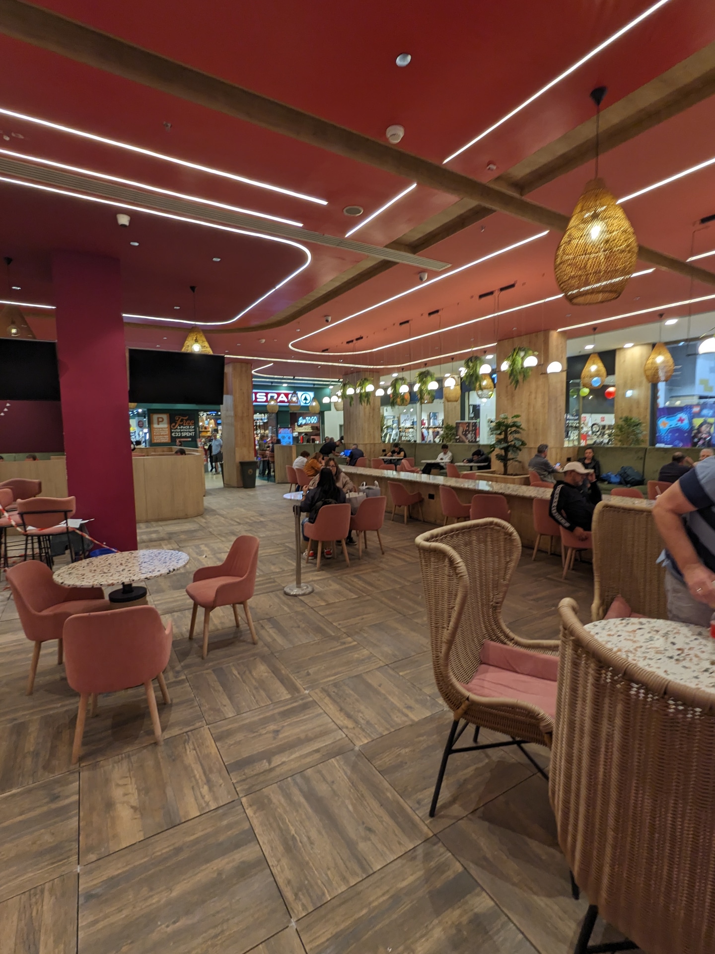 This is essentially a food court for the mall, but not in a fast food way. There is a cafe (Gusto Italiano) with reasonable price and quality coffee (€3 for a cappuccino) and they also do sandwiches and pastries. There's also a Spar with a large choice of sandwiches and bakery items you can eat here. The area is large and has lots of seating with plugs at almost every table. When I visited on November 19th 2025 the WiFi was not working well, which was a huge frustration. You'll find a Eurosport WiFi which is open but also unreliable. And a SPAR Guest WiFi but when I asked for the code 3 people said they didn't know it. This is the main reason I'm only giving it 2 stars. As this place isn't really affiliated with any specific cafe you can stay as long as you like. It is not super comfortable though with the height or legroom at every table being a bit off. There used to be a Costa here too but it's gone as of November 2025.