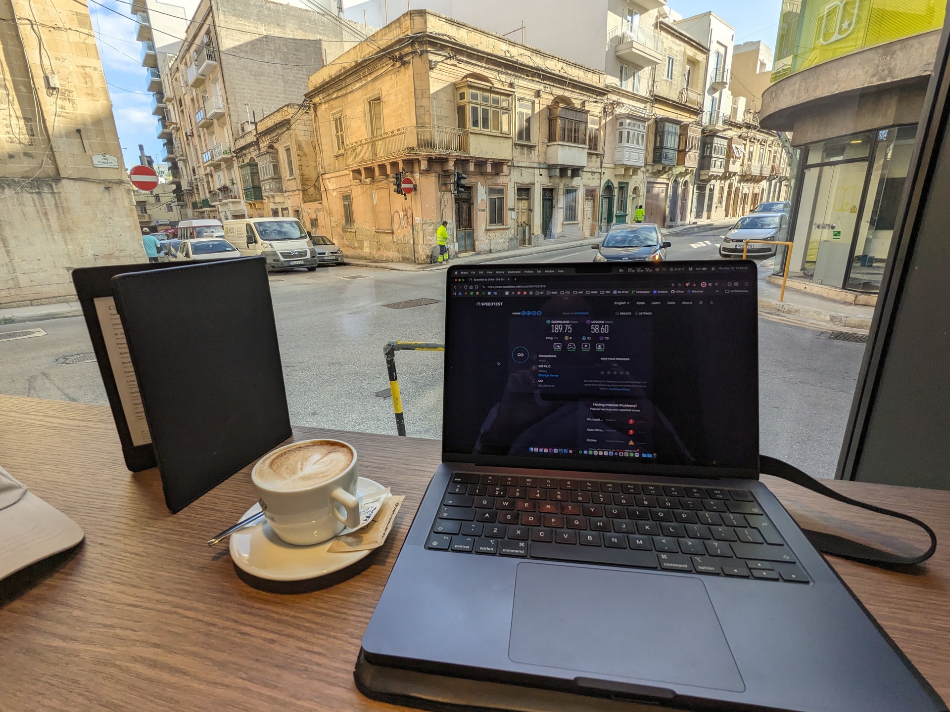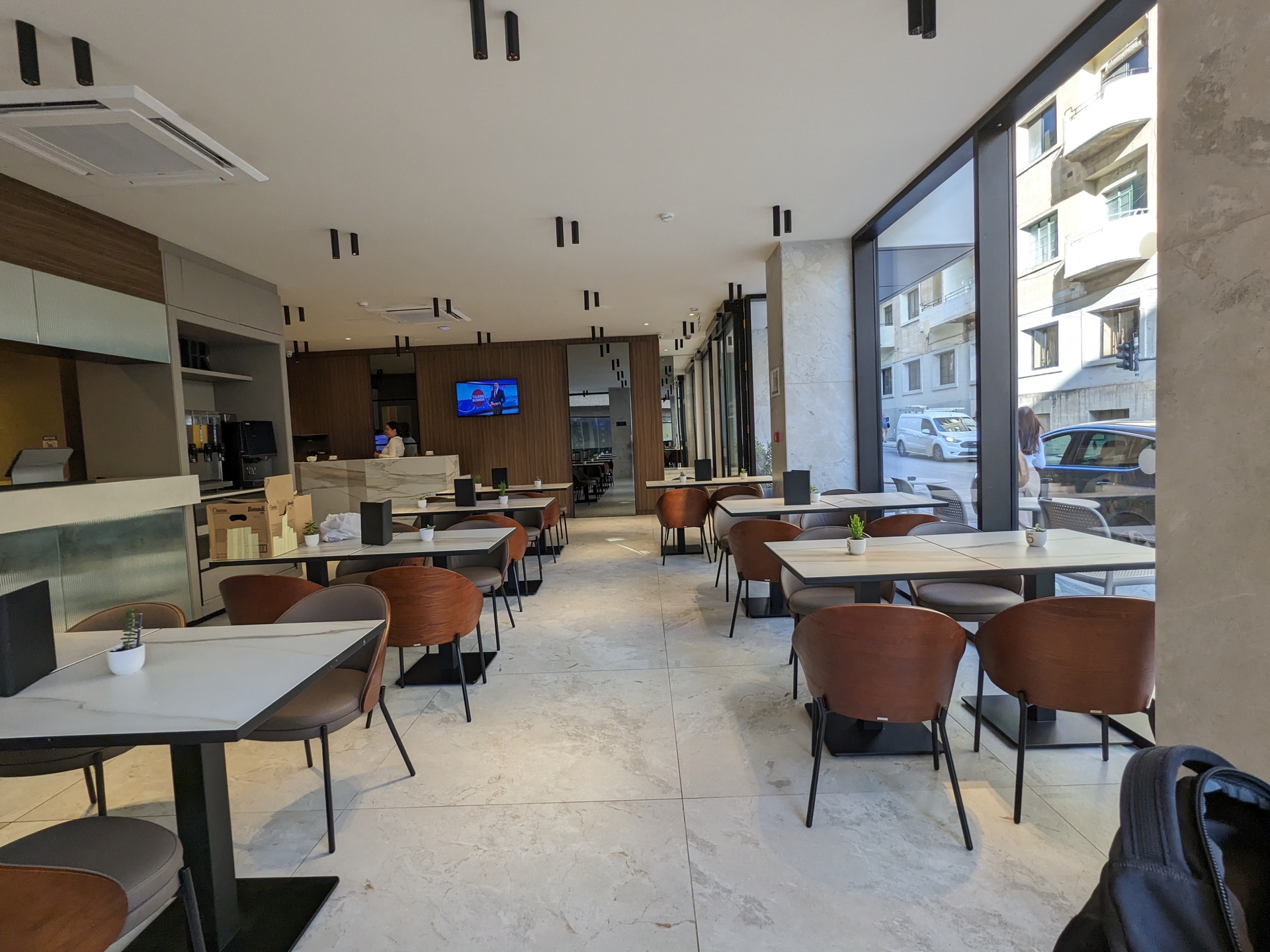 A brand new hotel with a smallish lobby / cafe area downstairs. The coffee was nothing special but very reasonably priced, I think it was €4.50 for a cappuccino and an espresso. I was the only person there and had a nice seat at the window. It was a good spot for people watching through the window too. But as I was the only one there it felt rather awkward to be there. After about an hour the waitress came to ask if I wanted something else. This was either good service or telling me it's time to buy more. I stayed around 2.5 hours in the end. They have a small amount of food on the menu like sandwiches but it wasn't available when I went.